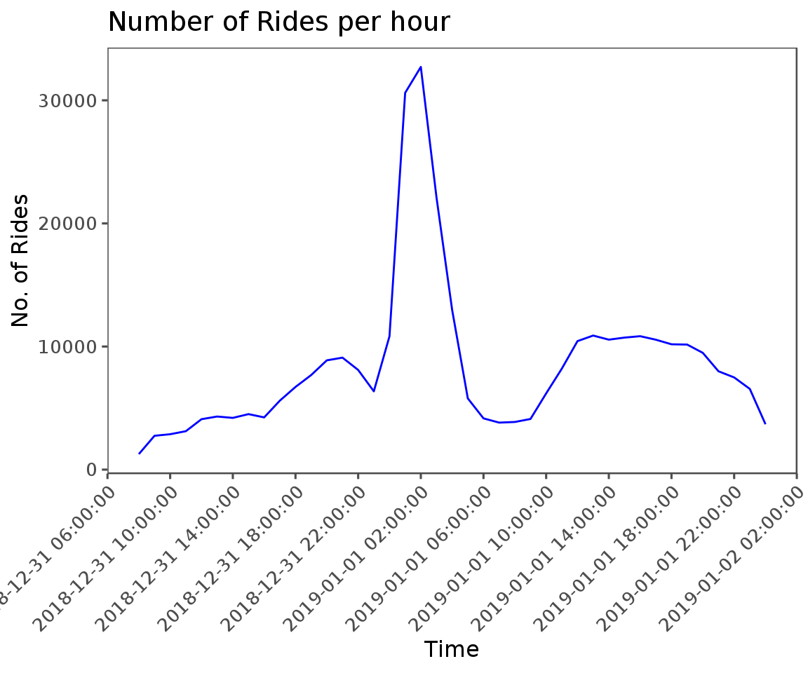 Using this data to plot the number of rides by hour reveals a large spike in the number of rides between midnight and 5am on the 1st. Not surprising that a spike in ridership would occur during this time, but the magnitude is definitely a bit striking!